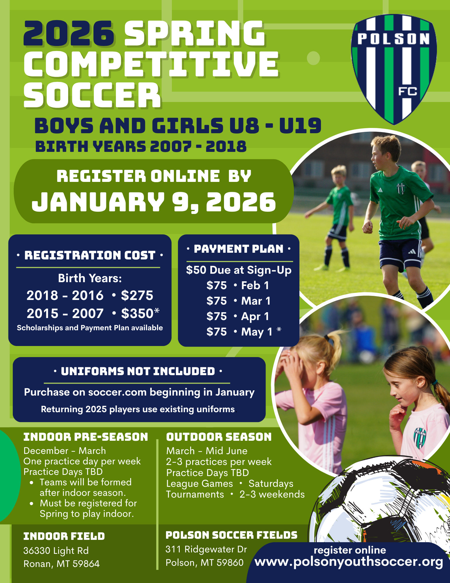 For assistance with the registration process contact our PYSA Registrar Amy Kinnick at amyk@polsonfc.org or (406) 955-1182