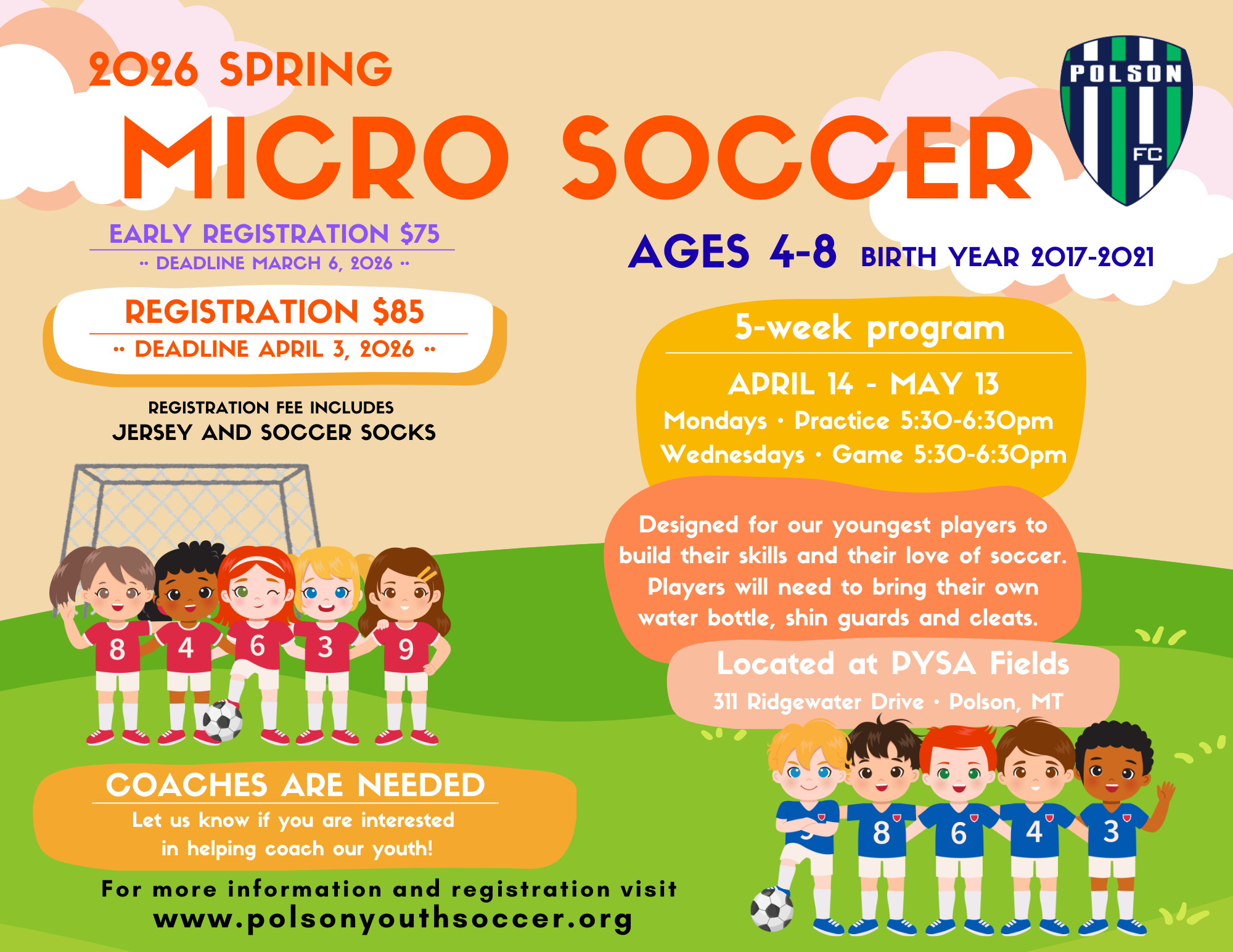 For assistance with the registration process contact our PYSA Registrar Amy Kinnick at amyk@polsonfc.org or (406) 955-1182